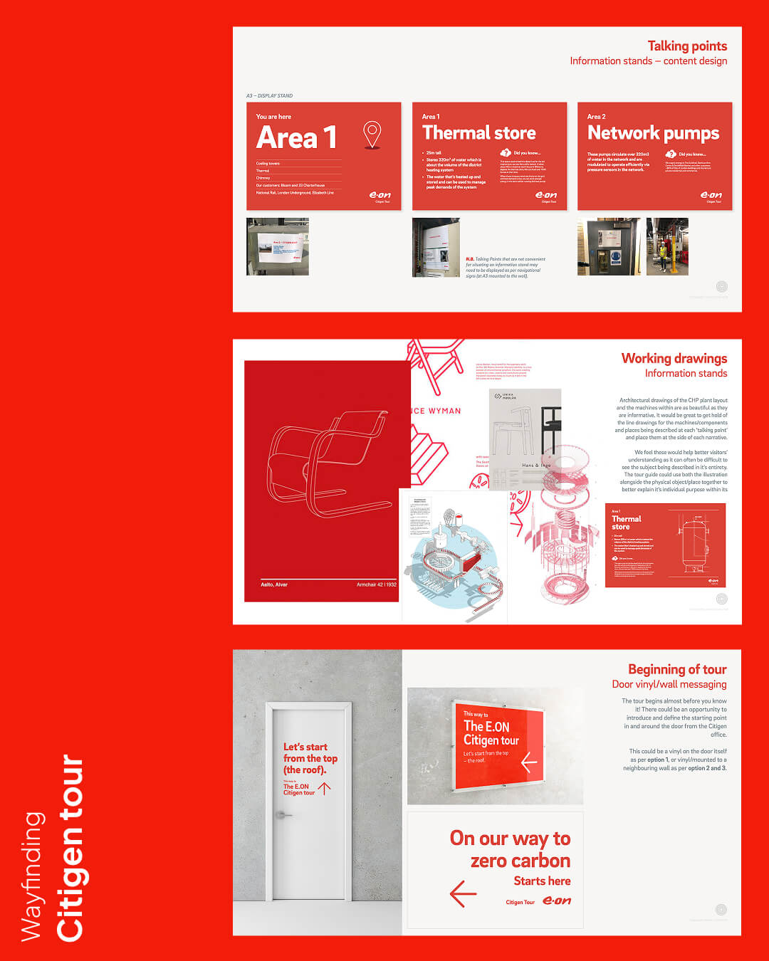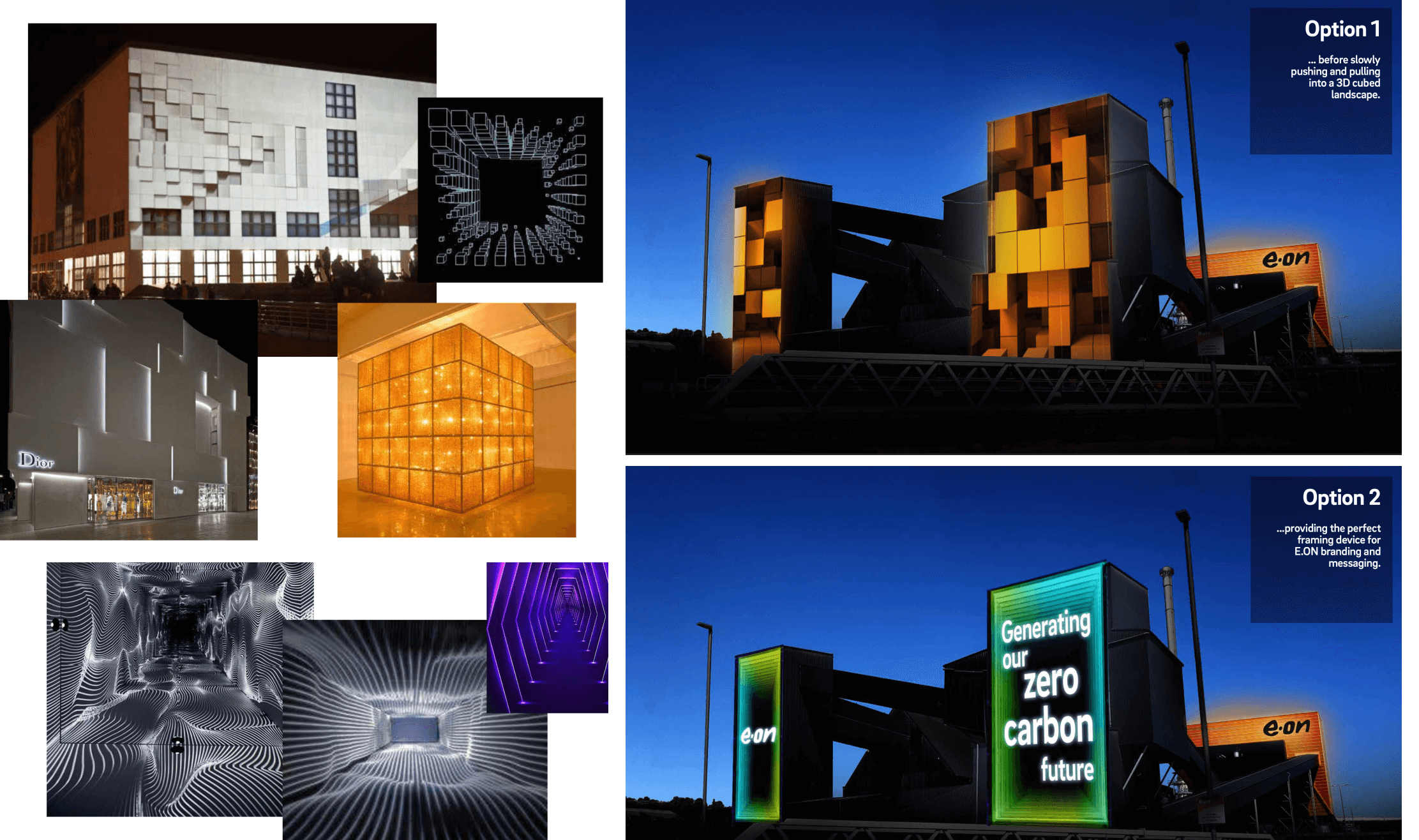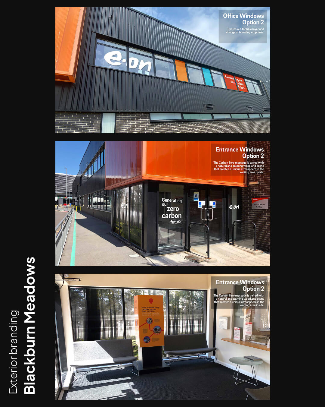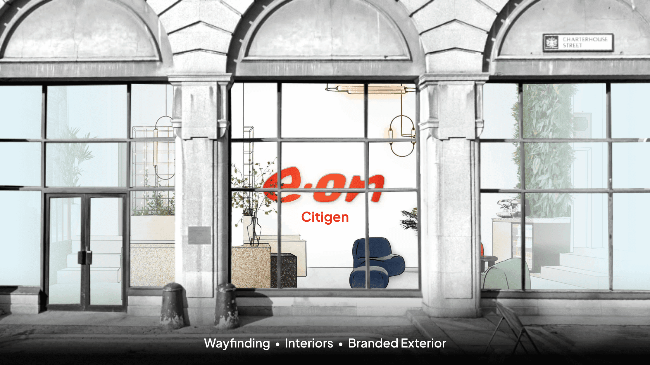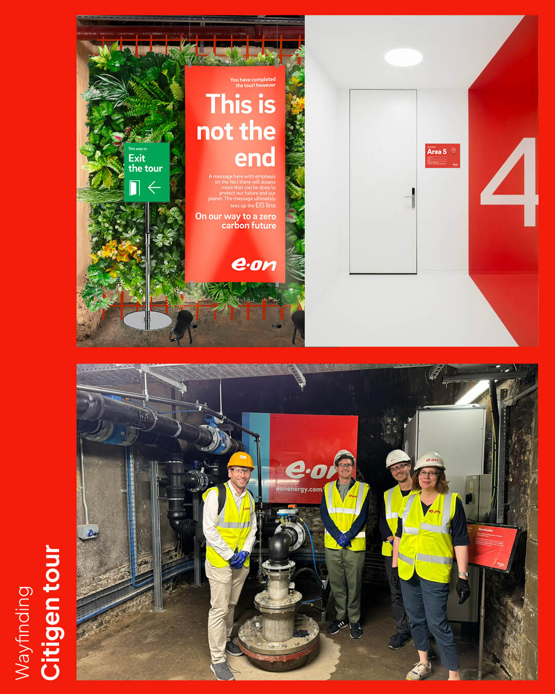 E.ON’s energy centres play a vital role in powering cities, yet often operate out of sight. The projects at Citigen in London and Blackburn Meadows in Sheffield set out to change that, using design to make these industrial sites more visible, engaging and reflective of the brand’s sustainability story. Work included developing a scalable visitor tour system with clear, consistent signage and navigation; exploring entrance and façade concepts to improve street presence; and creating large-scale exterior treatments and animated projections visible from the motorway, supported by early interior mood boards and layouts to extend the experience inside.